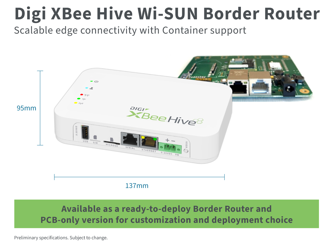 Der Digi XBee Hive Border Router dient als Gateway zwischen Ihrem Wi-SUN Mesh-Netzwerk und Ihrer bestehenden Infrastruktur. Diese zweckbestimmten Geräte lassen sich von Pilotprojekten bis hin zu Unternehmenseinsätzen skalieren und unterstützen Hunderte von Wi-SUN-Knoten pro Router.