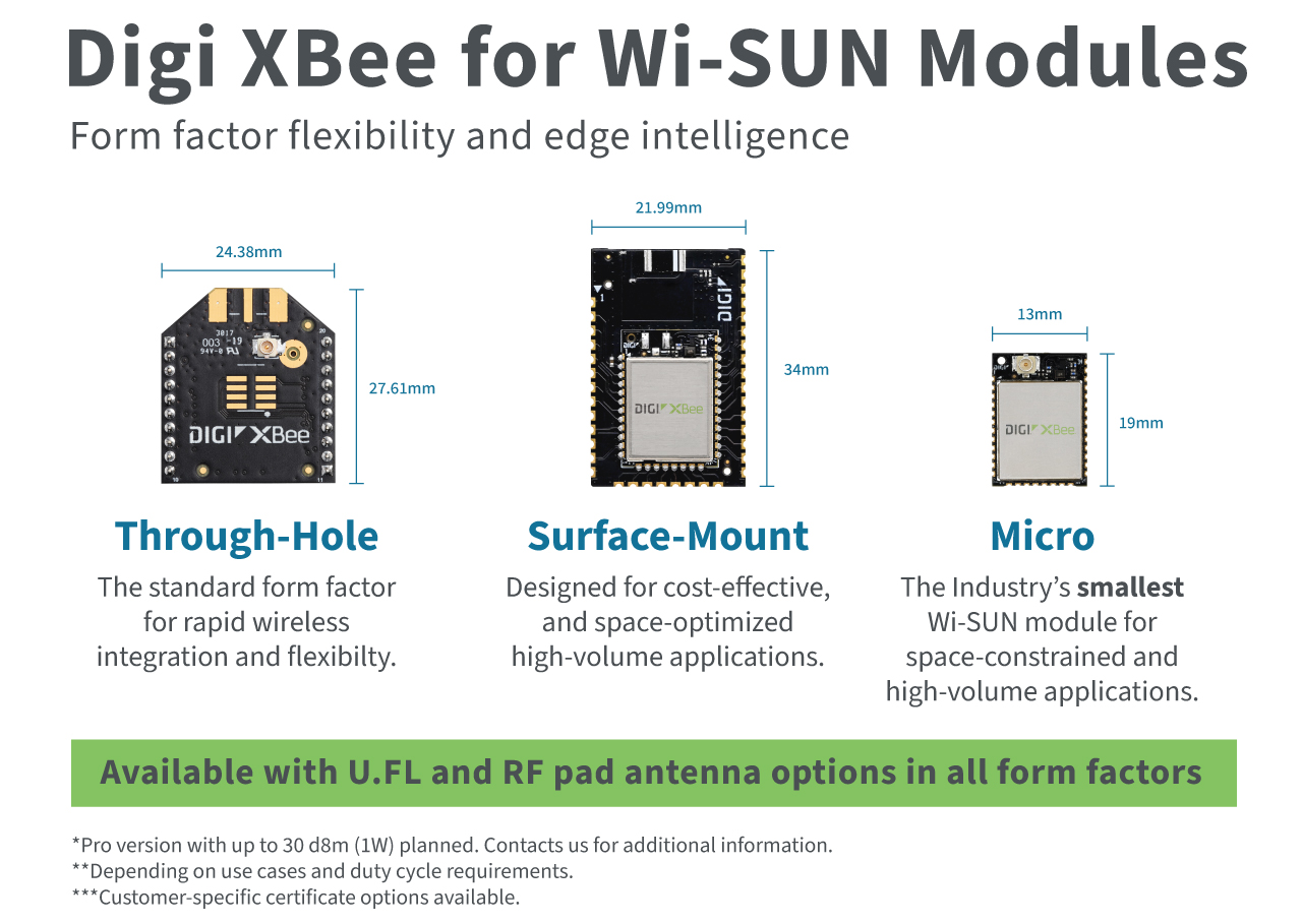 Die Digi XBee für Wi-SUN-Module sind in drei Industriestandard-Formfaktoren erhältlich (Durchsteckmontage, Oberflächenmontage und Mikromontage), die weltweit über 25 Millionen Modulimplementierungen ermöglicht haben, und bieten maximale Designflexibilität. Die Module sind in zwei Varianten erhältlich: Leaf Node (LFN)-Module erreichen eine Batterielebensdauer von bis zu 10 Jahren für entfernte Sensoren mit optionaler Bluetooth LE-Konnektivität, während Full Function Node (FFN)-Module stromversorgte Geräte sind, die Anwendungen mit hohem Durchsatz und Datenraten von bis zu 2,4 Mbps unterstützen.